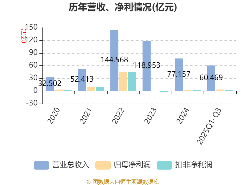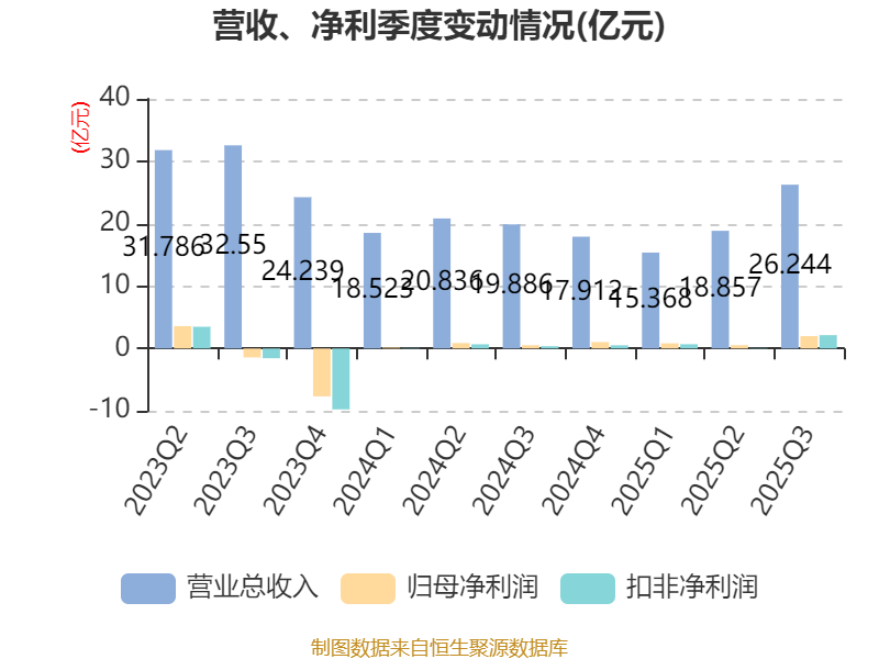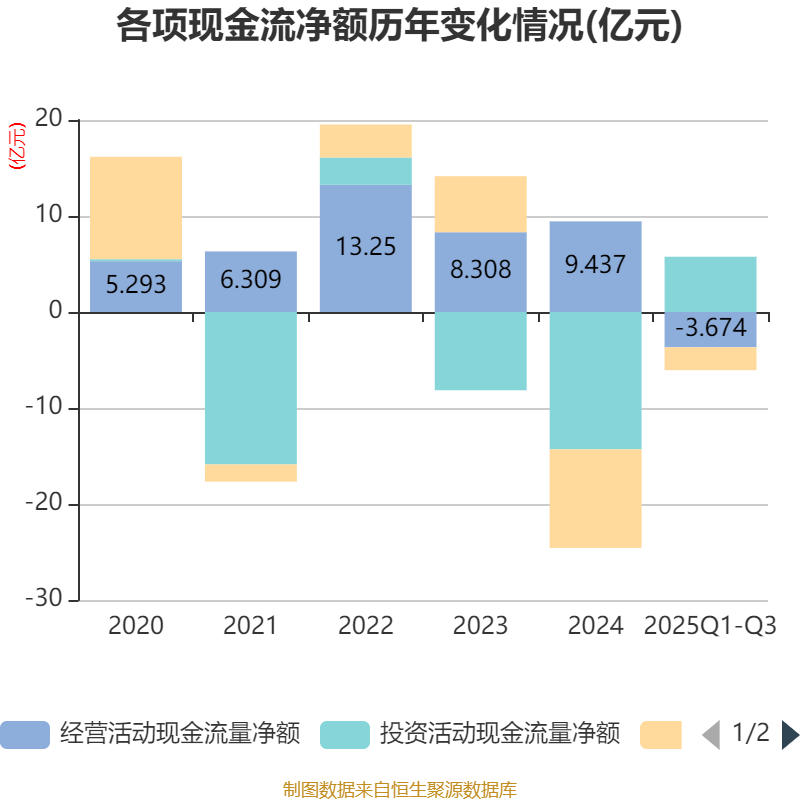 2025年前三季度,公司经营活动现金流净额为-3.67亿元,同比减少9.27亿元;筹资活动现金流净额-2.39亿元,同比增加7.7亿元;投资活动现金流净额5.76亿元,上年同期为-15.04亿元。