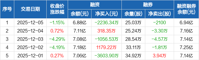 雅化集团融资融券信息显示,2025年12月5日融资净偿还2236.34万元;融资余额6.88亿元,较前一日下降3.15%。