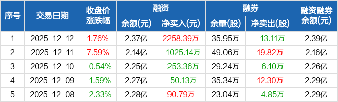 汉缆股份:融资净买入2258.39万元,融资余额2.37亿元(12-12)