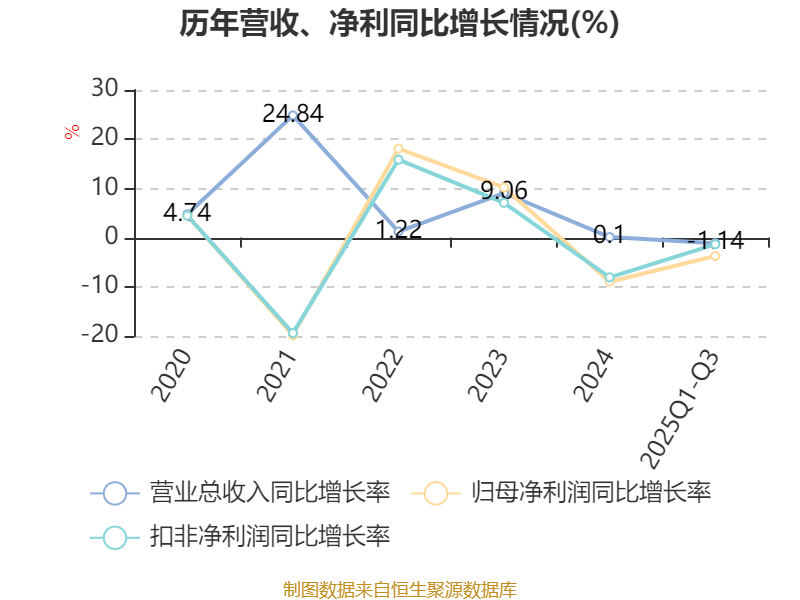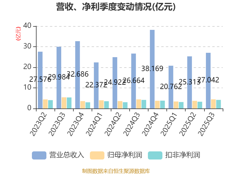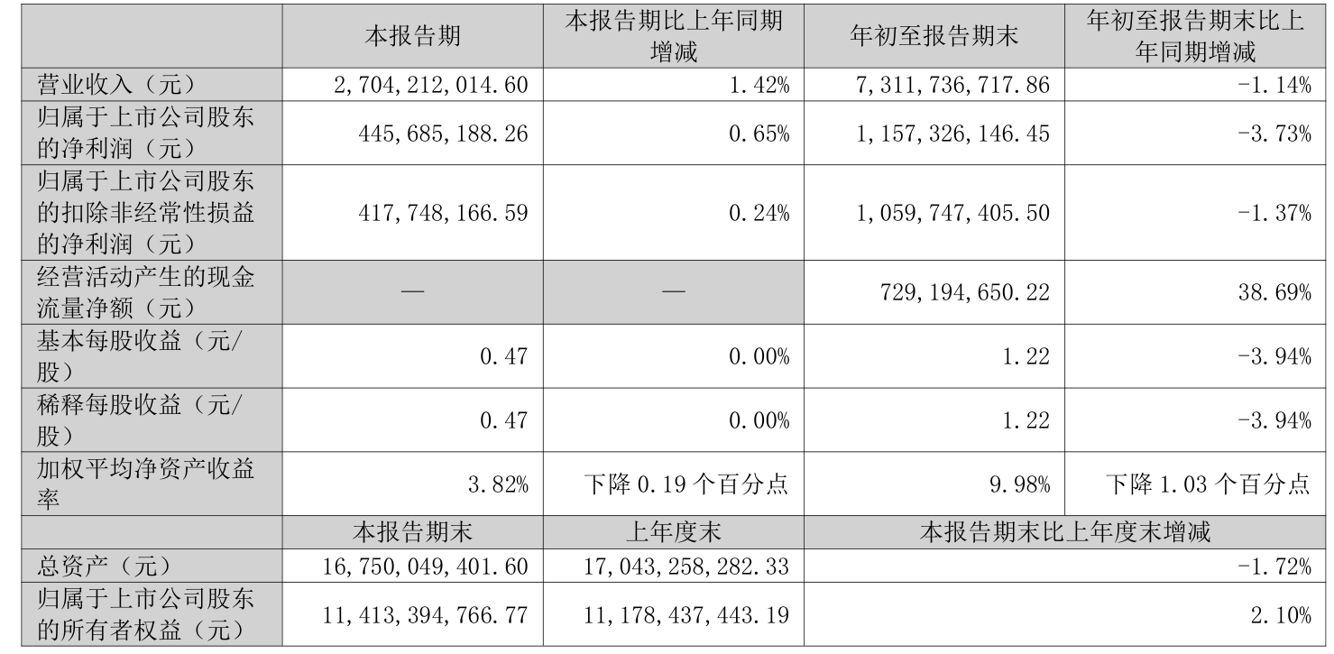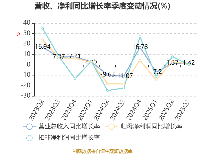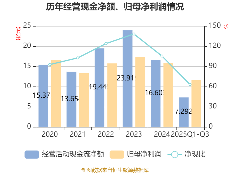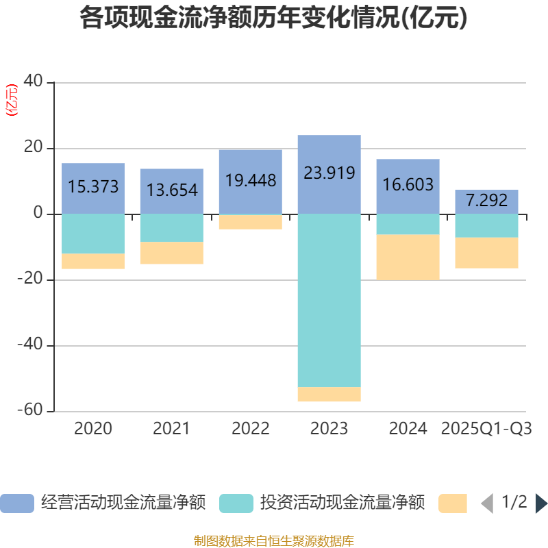 2025年前三季度,公司经营活动现金流净额为7.29亿元,同比增长38.69%;筹资活动现金流净额-9.35亿元,同比增加4.91亿元;投资活动现金流净额-7.25亿元,上年同期为9701.73万元。