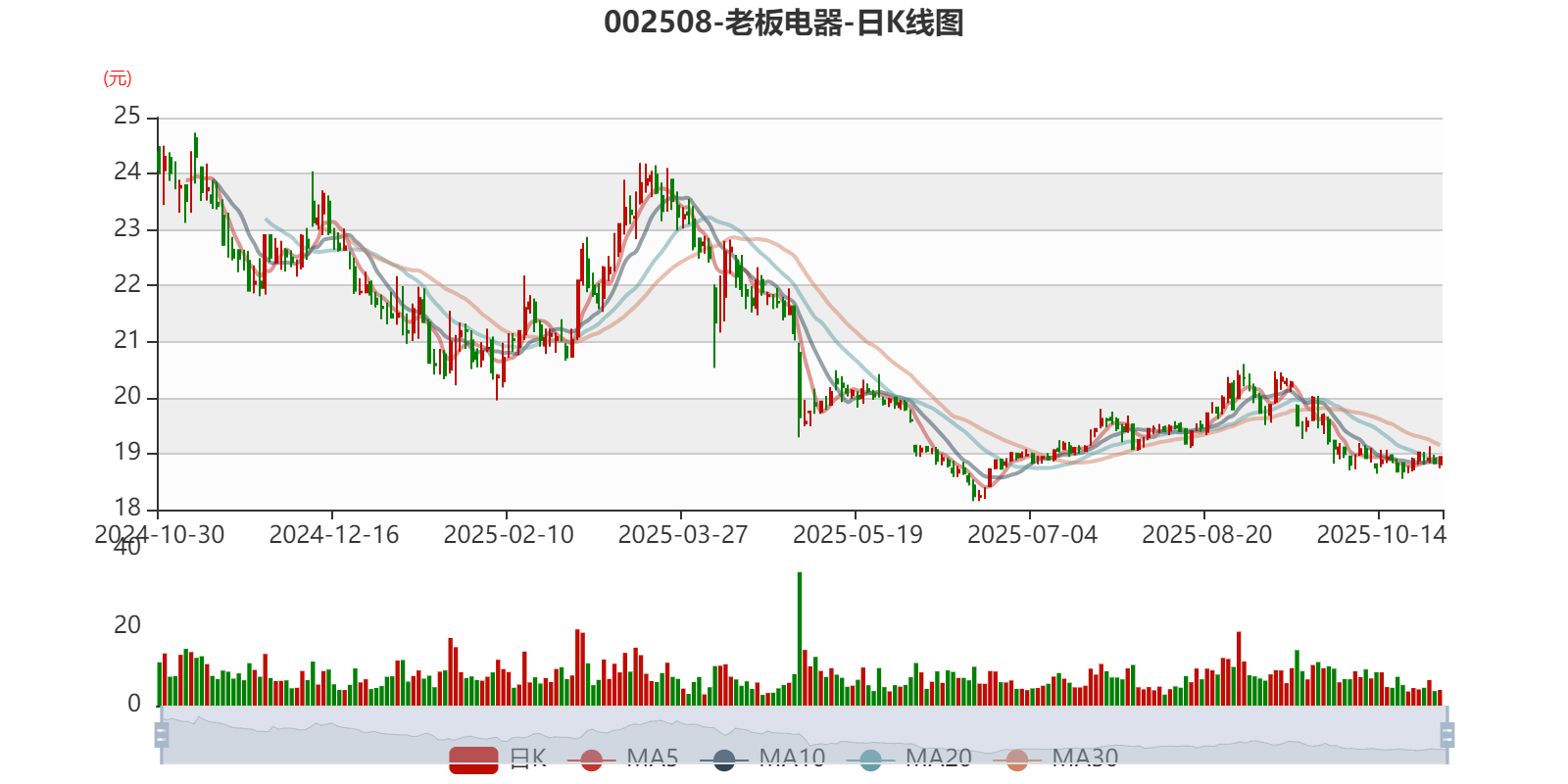 中证智能财讯老板电器(002508)10月30日披露2025年第三季度报告。前三季度公司实现营业总收入73.12亿元,同比下降1.14%;归母净利润11.57亿元,同比下降3.73%;扣非净利润10.6亿元,同比下降1.37%;经营活动产生的现金流量净额为7.29亿元,同比增长38.69%;报告期内,老板电器基本每股收益为1.22元,加权平均净资产收益率为9.98%。