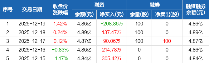 齐峰新材:融资净偿还208.86万元,融资余额4.86亿元(12-19)