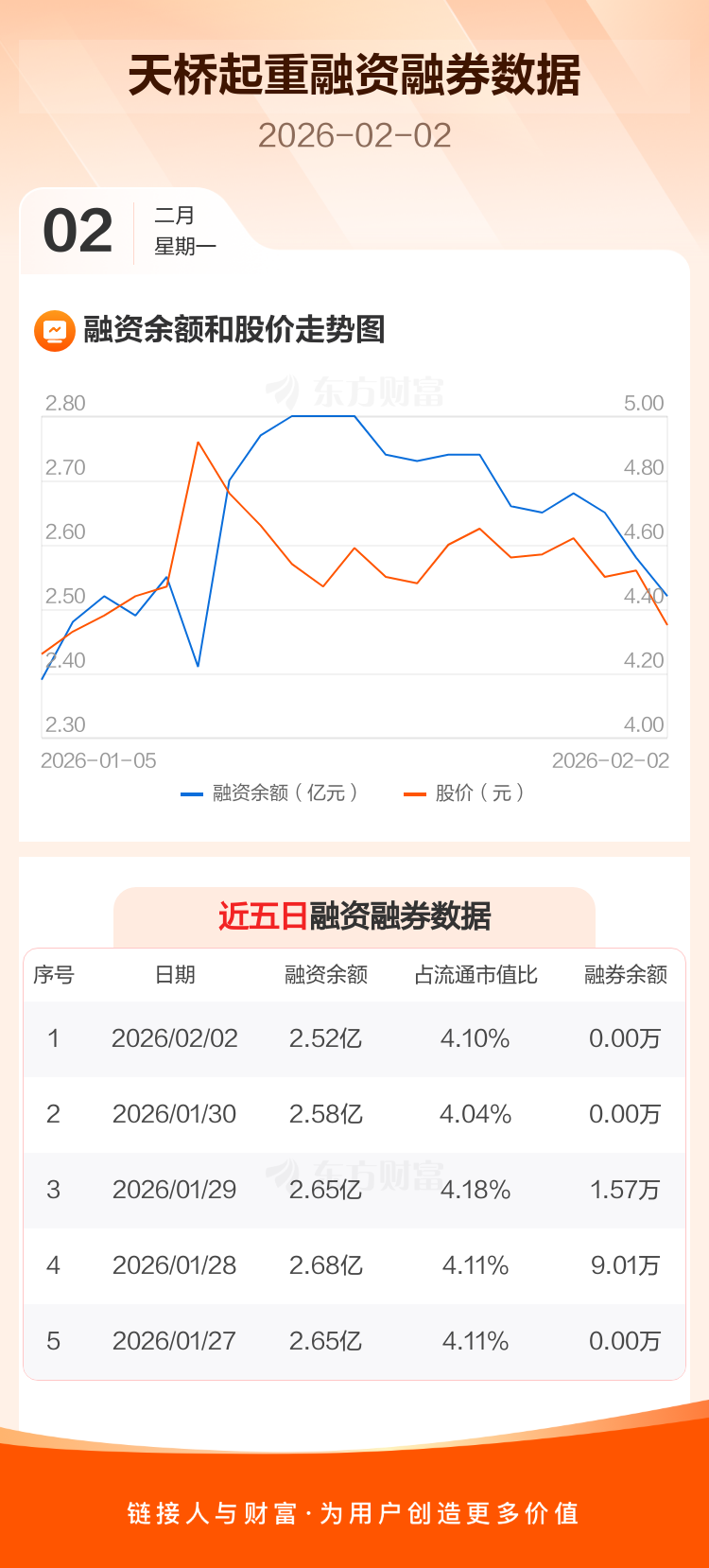 交易所最新数据显示,天桥起重于2026年2月2日获融资买入1087.55万元,融资偿还1684.31万元,当日融资净偿还596.76万元。目前,该股融资余额2.52亿,占流通市值比例为4.10%。