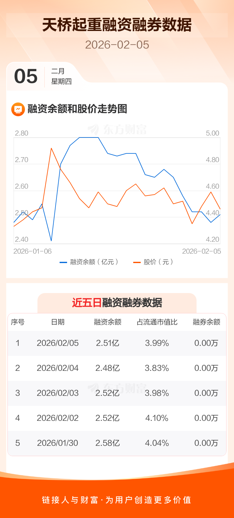 交易所最新数据显示,天桥起重于2026年2月5日获融资买入1349.40万元,融资偿还1001.03万元,当日融资净买入348.37万元。目前,该股融资余额2.51亿,占流通市值比例为3.99%。