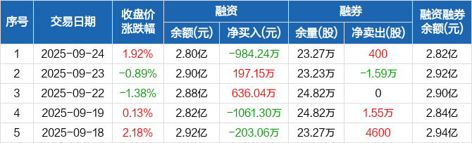 天顺风能:融资净偿还984.24万元,融资余额2.8亿元(09-24)