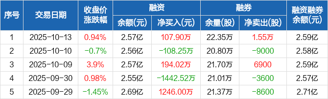 融资方面,当日融资买入3652.33万元,融资偿还3544.43万元,融资净买入107.9万元。融券方面,融券卖出3.93万股,融券偿还2.38万股,融券余量22.35万股,融券余额191.09万元。融资融券余额合计2.59亿元。