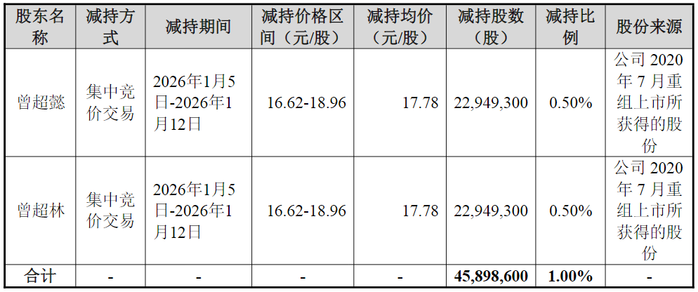 1月13日盘后,天山铝业发布了关于实际控制人股份减持计划实施完成的公告。该公告显示,2026年1月5日至2026年1月12日,公司实际控制人曾超懿和曾超林通过集中竞价方式,分别减持其持有的公司股份2294.93万股,减持均价皆为17.78元,合计套现金额约为8.16亿元。在完成本次减持计划后,曾超懿、曾超林及其一致行动人合计持股比例由37.00%下降至36.67%。
