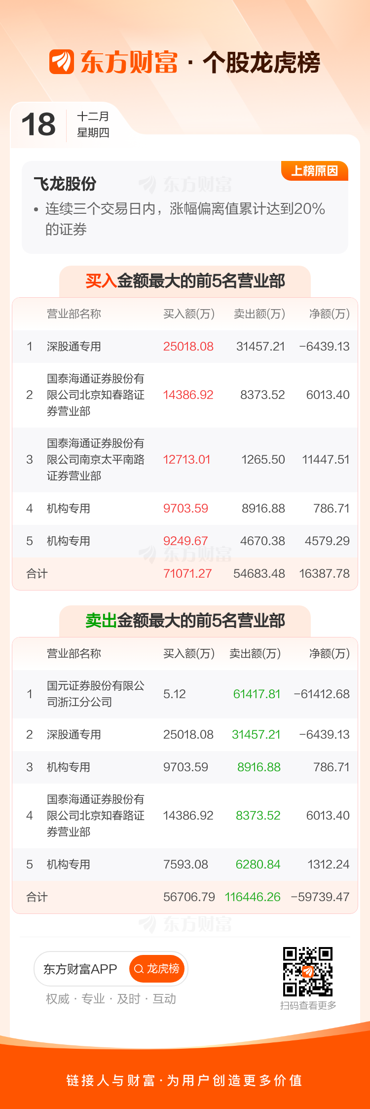 交易所2025年12月18日公布的交易公开信息显示,飞龙股份因成为连续三个交易日内,涨幅偏离值累计达到20%的证券上榜。飞龙股份当日收报29.65元,涨跌幅7.47%,换手率33.86%,成交额55.68亿。异常期间12月16日至12月18日,期间涨幅28.47%,累计偏离值29.02%,区间成交额80.35亿。