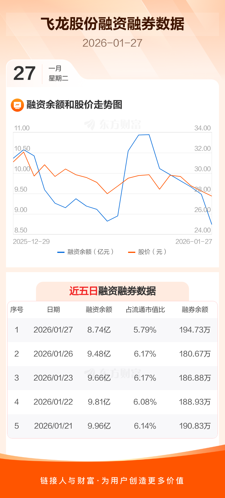 交易所最新数据显示,飞龙股份于2026年1月27日获融资买入8355.43万元,融资偿还1.57亿元,当日融资净偿还7309.91万元。目前,该股融资余额8.74亿,占流通市值比例为5.79%。
