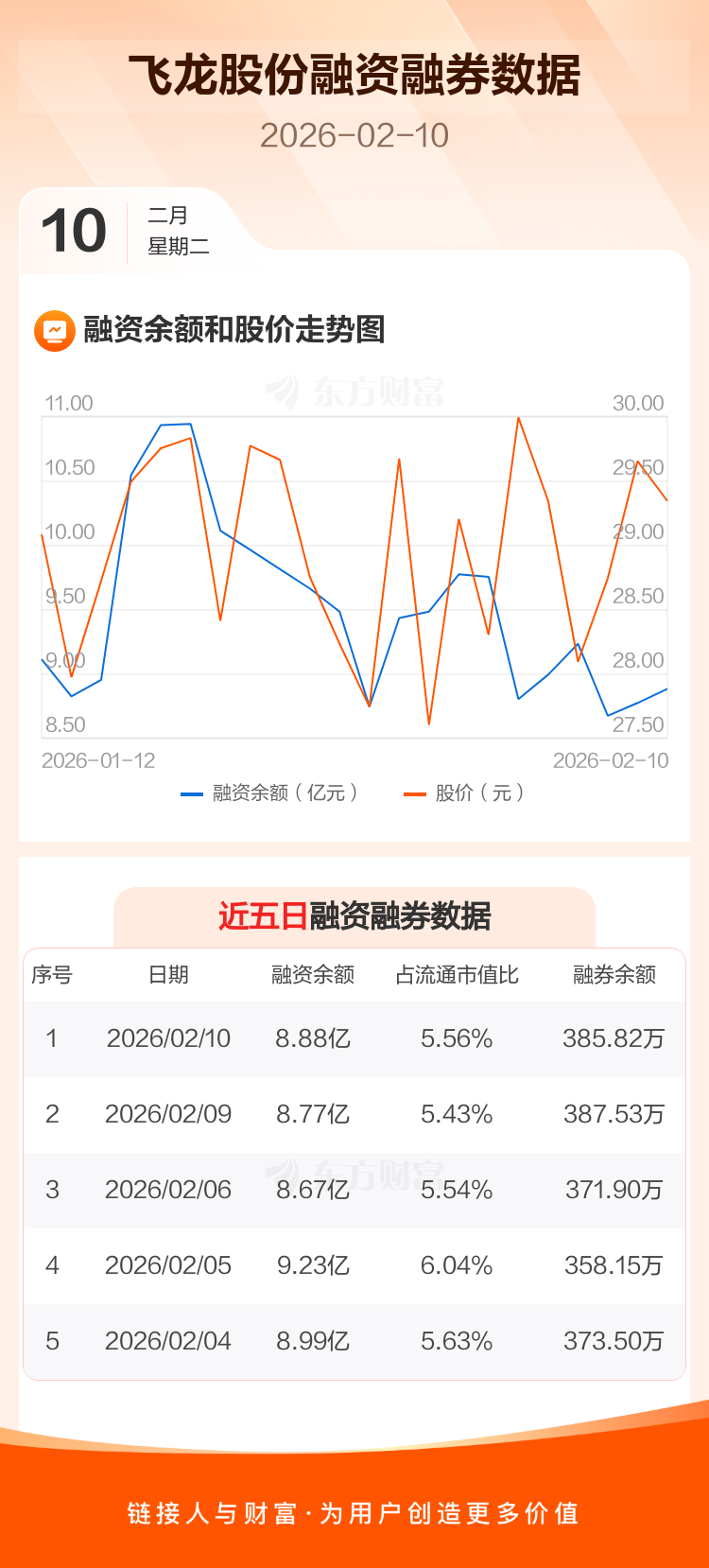 交易所最新数据显示,飞龙股份于2026年2月10日获融资买入7221.99万元,融资偿还6121.35万元,当日融资净买入1100.64万元。目前,该股融资余额8.88亿,占流通市值比例为5.56%。