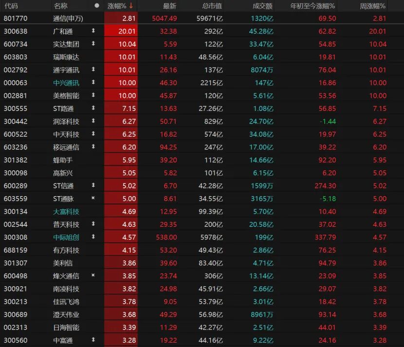 8只通信股涨停,广和通“20cm”涨停,实达集团、瑞斯康达、通宇通讯、中兴通讯、美格智能涨停。