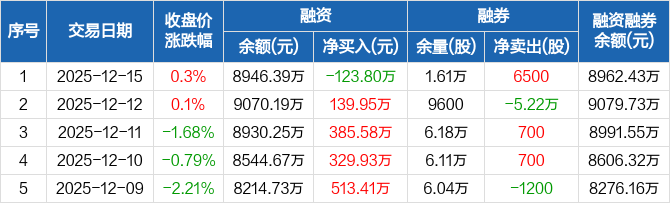 万和电气:融资净偿还123.8万元,融资余额8946.39万元(12-15)