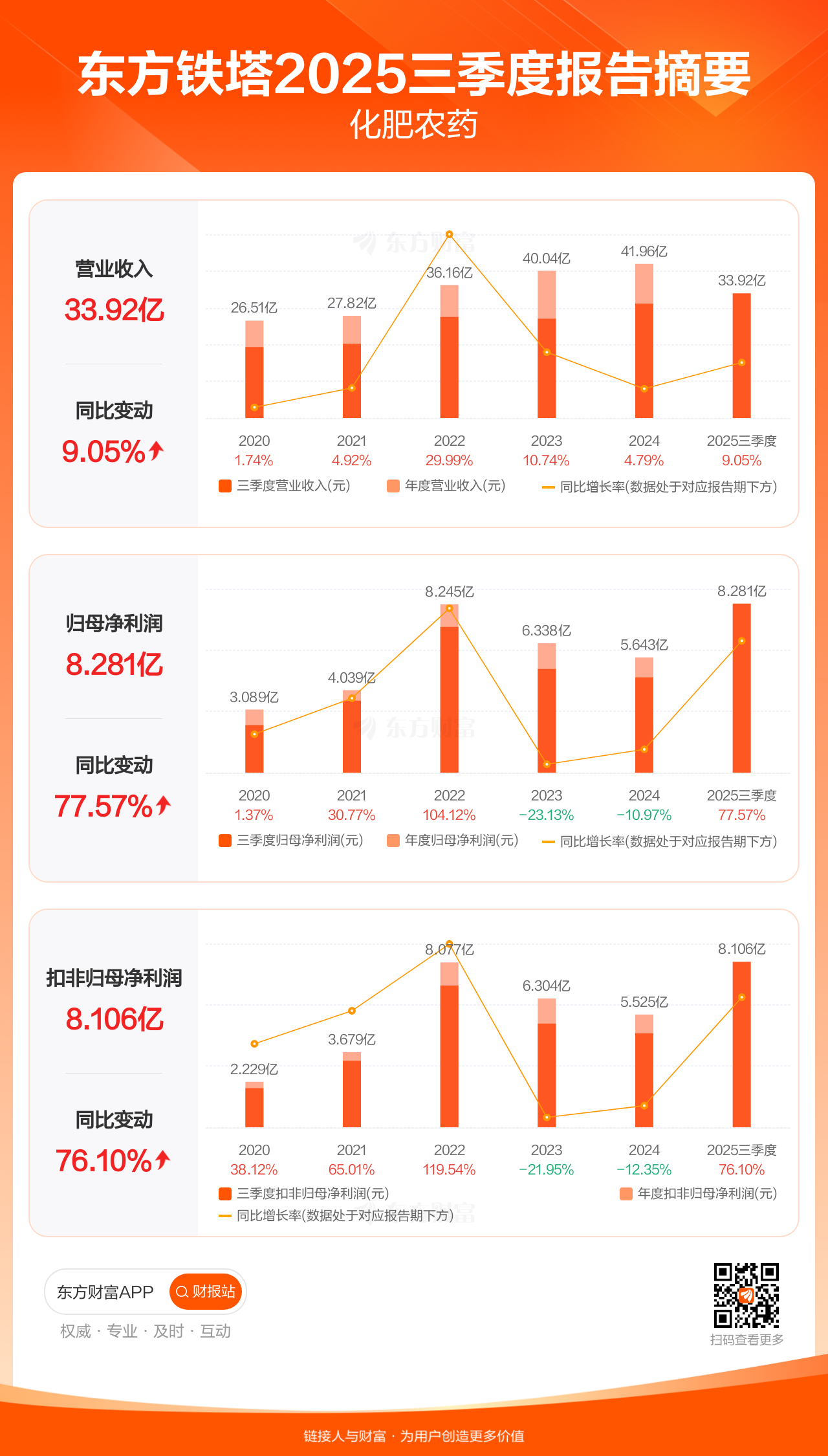 东方铁塔10月30日发布2025年三季报显示,公司前三季实现营业收入33.92亿元,同比增长9.05%;归母净利润8.28亿元,同比增长77.57%;扣非归母净利润8.11亿元,同比增长76.10%。