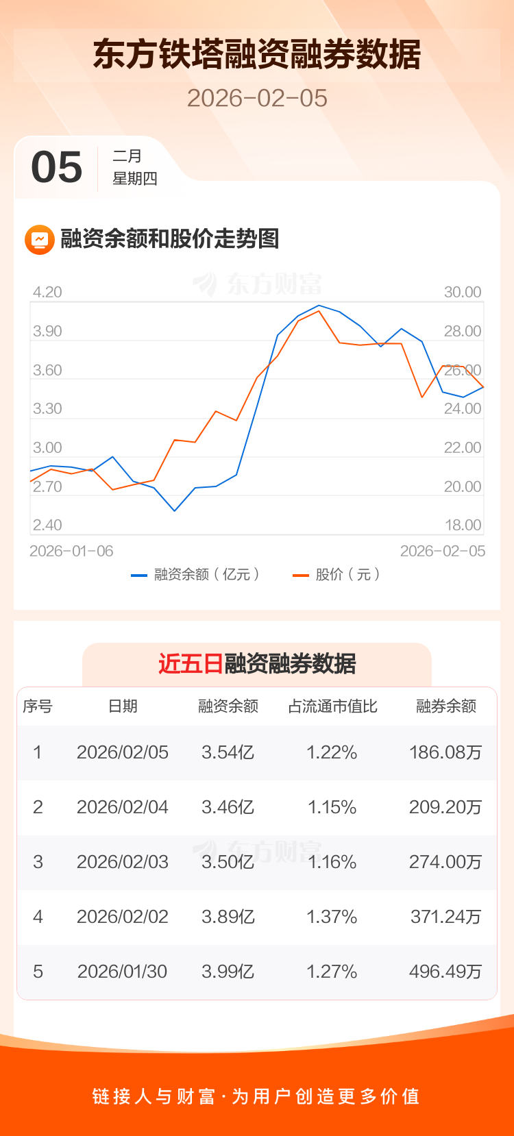 交易所最新数据显示,东方铁塔于2026年2月5日获融资买入3153.69万元,融资偿还2358.60万元,当日融资净买入795.09万元。目前,该股融资余额3.54亿,占流通市值比例为1.22%。