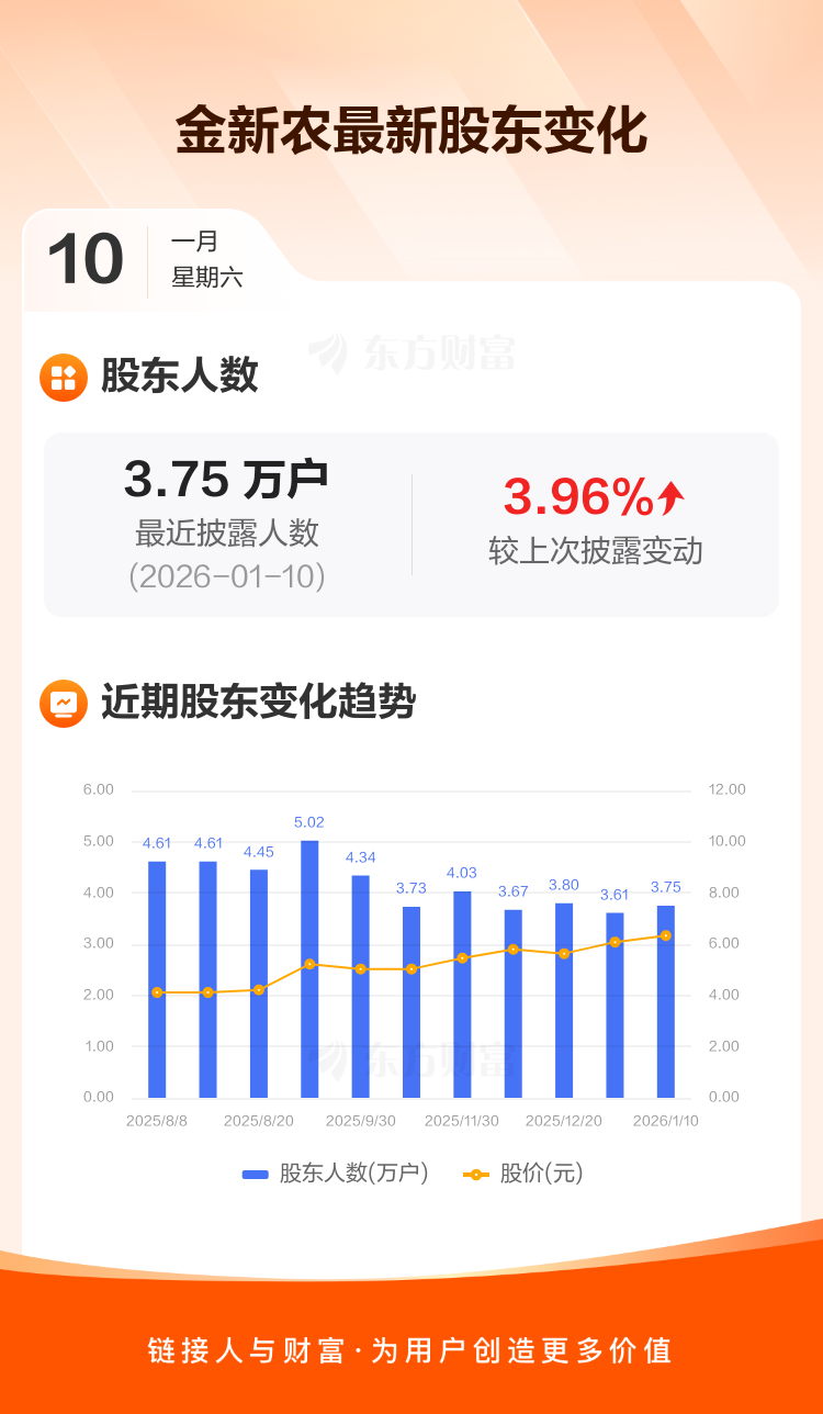 金新农:截至1月10日最新股东户数3.75万户,较上期增加3.96%