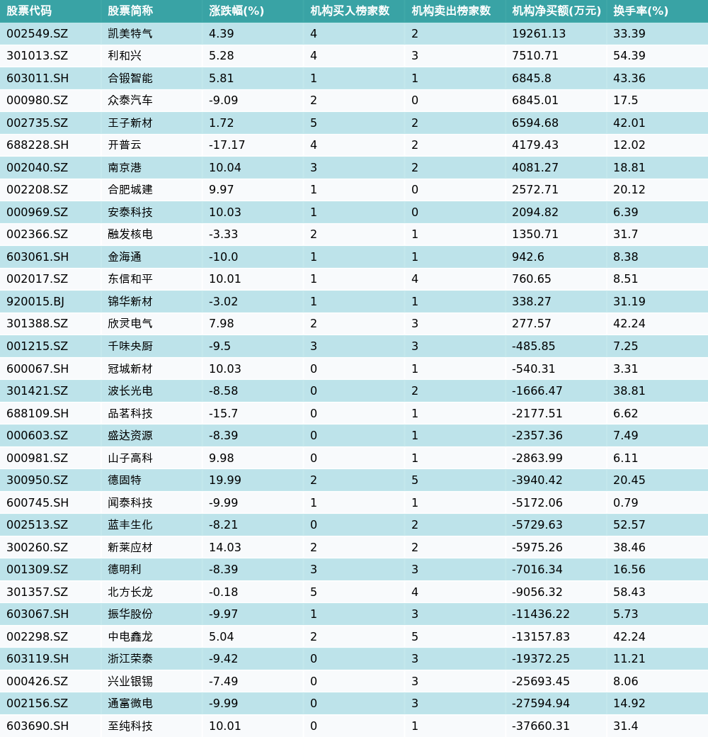 南财智讯10月14日电,南财金融终端数据显示,因当日异动登上龙虎榜的个股中,32只沪深A股龙虎榜出现了机构的身影,机构合计净卖出118241.16万元,具体来看,机构净买入14只个股,净卖出18只个股。其中,机构净买入前三分别为凯美特气(002549.SZ)、利和兴(301013.SZ)与合锻智能(603011.SH),详情见下图:机构净卖出的个股中,前三分别为至纯科技(603690.SH)、通富微电(002156.SZ)与兴业银锡(000426.SZ)。