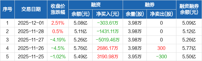 融资方面,当日融资买入1.74亿元,融资偿还1.77亿元,融资净偿还303.61万元,连续3日净偿还累计6754.17万元。融券方面,融券卖出0股,融券偿还0股,融券余量3.98万股,融券余额90.86万元。融资融券余额合计5.09亿元。