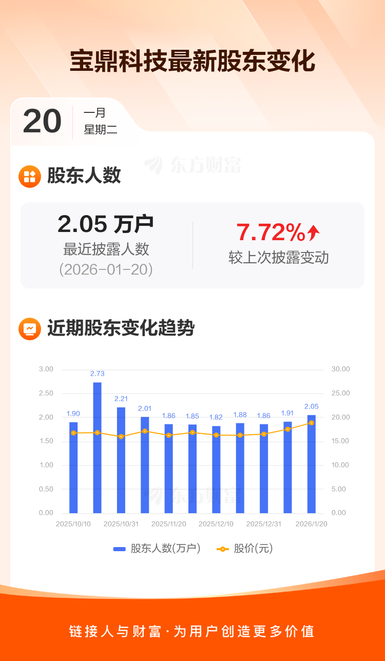 宝鼎科技最新披露数据显示,截至1月20日公司股东户数为2.05万户,较上期(2026年1月9日)增加1473户,增幅为7.72%。户均持有流通股数量由上期的1.93万股下降至1.79万股,户均持股金额由上期的33.87万元减少至33.85万元。