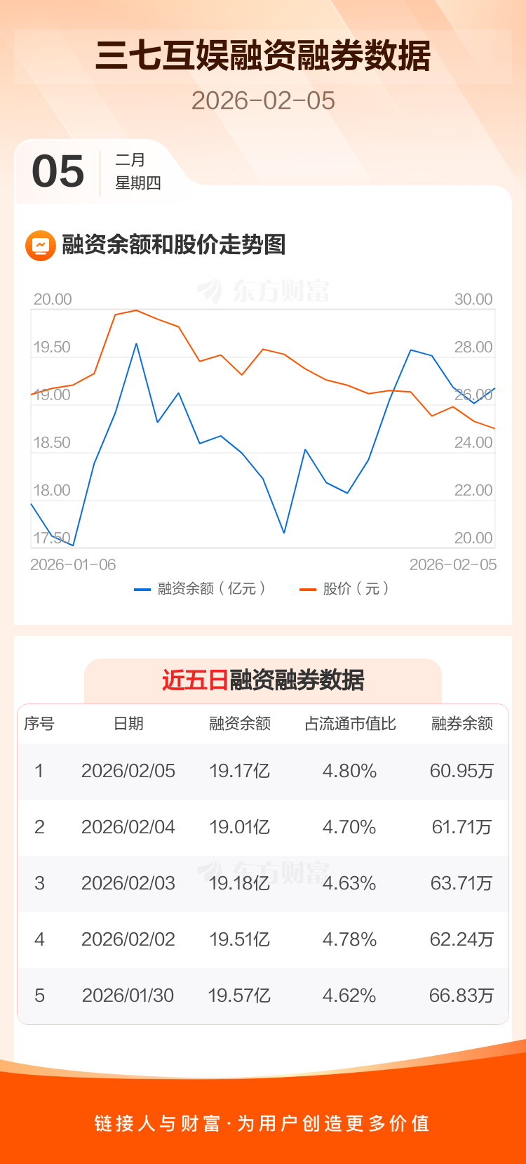 交易所最新数据显示,三七互娱于2026年2月5日获融资买入8913.13万元,融资偿还7287.93万元,当日融资净买入1625.21万元。目前,该股融资余额19.17亿,占流通市值比例为4.80%。