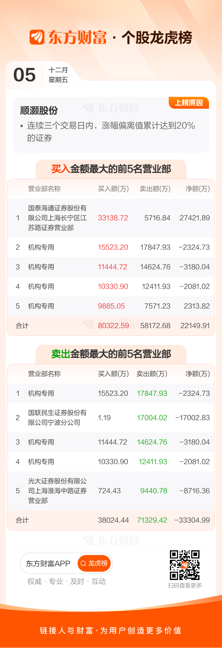 交易所2025年12月5日公布的交易公开信息显示,顺灏股份因成为连续三个交易日内,涨幅偏离值累计达到20%的证券上榜。顺灏股份当日收报11.9元,涨跌幅9.98%,换手率13.26%,成交额16.11亿。异常期间12月3日至12月5日,期间涨幅22.55%,累计偏离值22.28%,区间成交额83.25亿。
