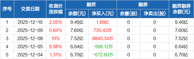 融资方面,当日融资买入6.4亿元,融资偿还4.54亿元,融资净买入1.86亿元,净买入额创历史新高,净买入额两市排名第七,连续3日净买入累计2.82亿元。融券方面,融券卖出0股,融券偿还0股,融券余量0股,融券余额0元。融资融券余额合计9.46亿元。