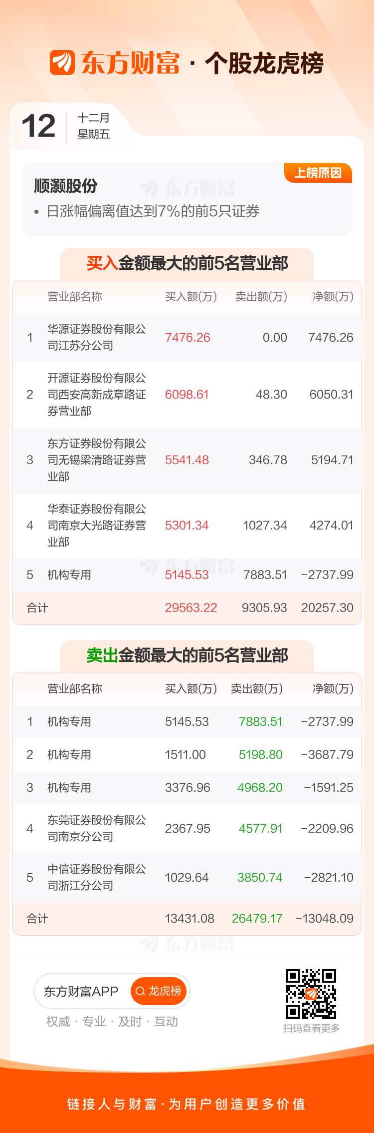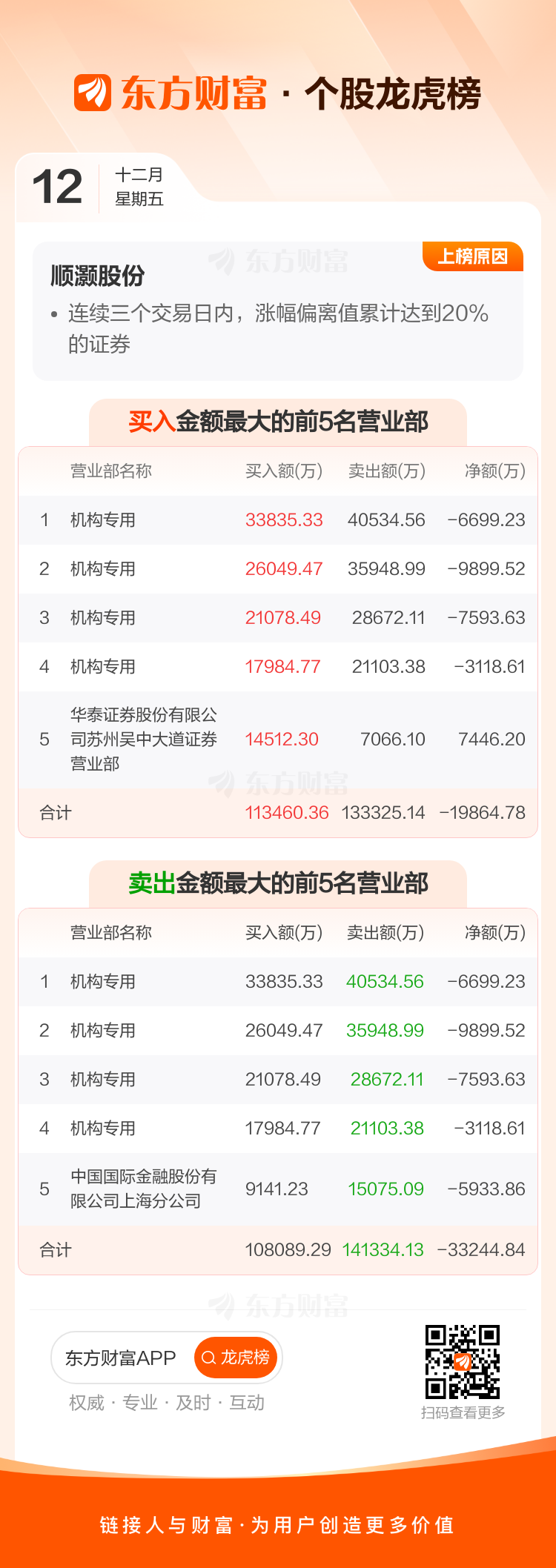 交易所2025年12月12日公布的交易公开信息显示,顺灏股份因成为日涨幅偏离值达到7%的前5只证券、连续三个交易日内,涨幅偏离值累计达到20%的证券上榜。顺灏股份当日收报15.95元,涨跌幅10.00%,偏离值9.34%,换手率19.56%,成交额32.51亿。异常期间12月10日至12月12日,期间涨幅20.83%,累计偏离值21.34%,区间成交额128.25亿。