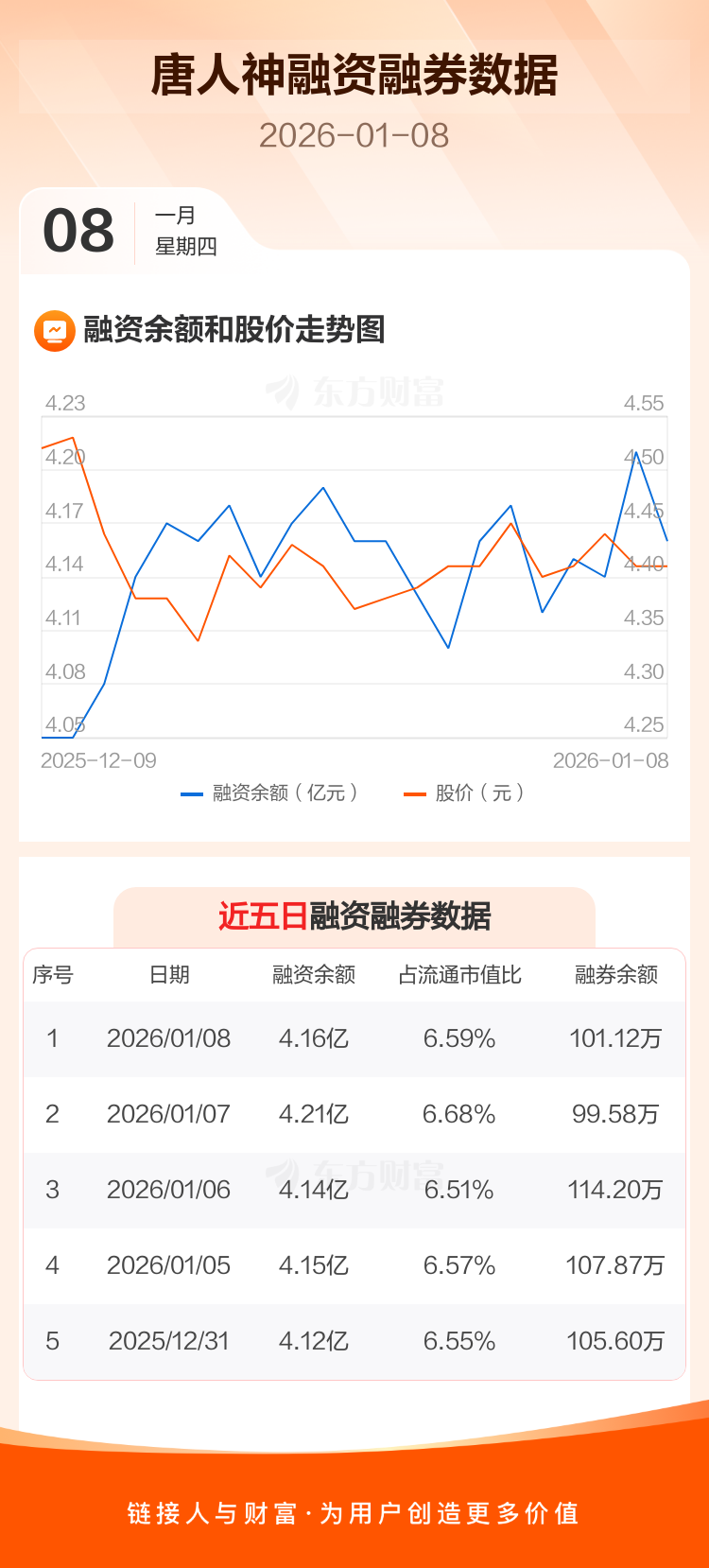交易所最新数据显示,唐人神于2026年1月8日获融资买入883.64万元,融资偿还1419.62万元,当日融资净偿还535.98万元。目前,该股融资余额4.16亿,占流通市值比例为6.59%。
