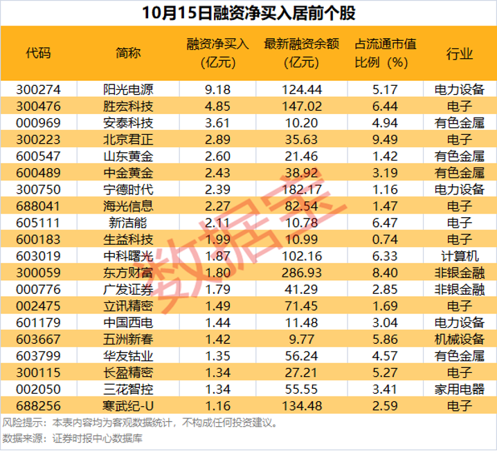 阳光电源融资净买入额居首,当日净买入9.18亿元;其次是胜宏科技、安泰科技,融资净买入金额分别为4.85亿元、3.61亿元。
