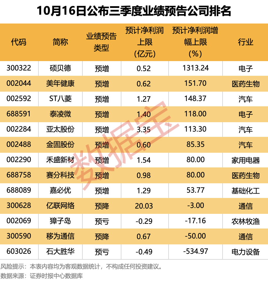 统计显示,今日(10月16日)共13家公司发布三季度业绩预告,其中,预增9家、预降2家、预亏2家。
