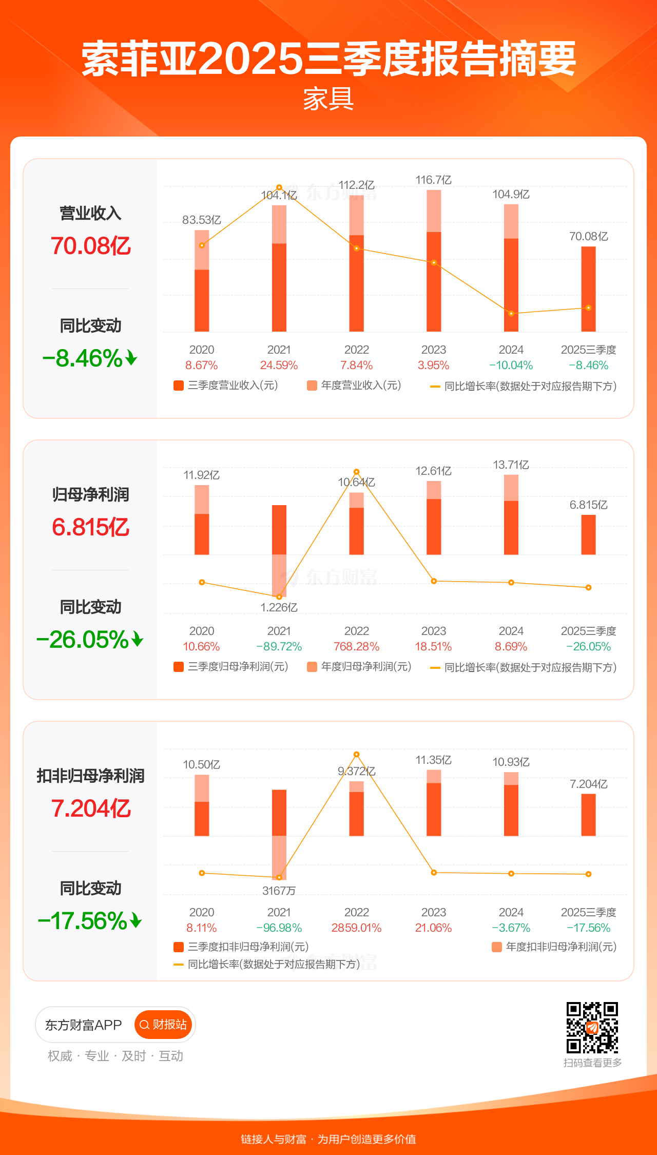 索菲亚10月28日发布2025年三季报显示,公司前三季实现营业收入70.08亿元,同比下滑8.46%;归母净利润6.82亿元,同比下滑26.05%;扣非归母净利润7.20亿元,同比下滑17.56%。