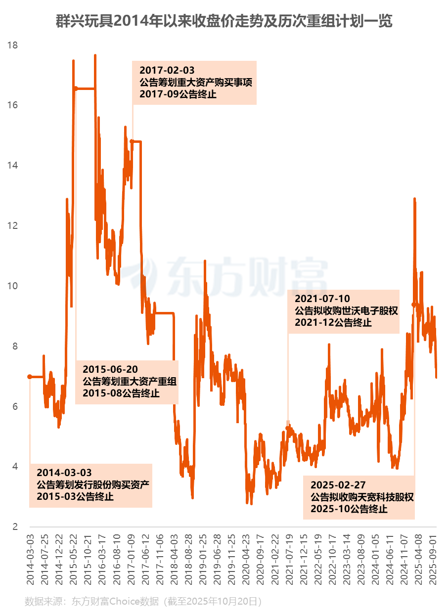 二级市场表现方面,2月26日并购公告发布翌日开始群兴玩具收获了一波三连板,不过其后股价急转直下,截至10月20日收盘过去近八个月公司股价降幅达24.84%,今年以来其股价降幅则为14.44%。相比之下,去年群兴玩具股价全年累计涨幅46.10%。