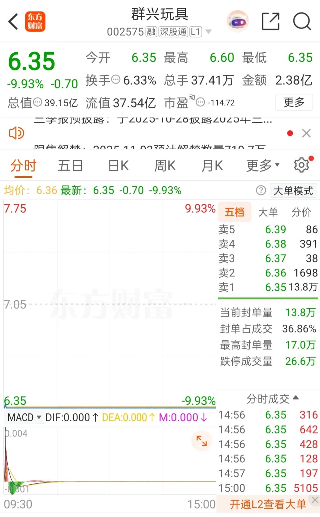 10月21日开盘,群兴玩具以跌停亮相,投资者“用脚投票”,表达对公司战略推进受挫的失望。截至收盘,跌停板封单仍超13万手,公司最新市值为39.15亿元。