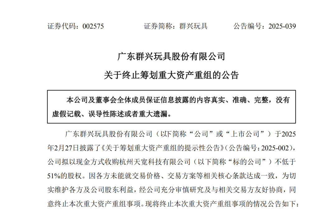 10月20日晚间,群兴玩具(证券代码:002575)突发公告称,因各方未能就交易价格、交易方案等相关核心条款达成一致,决定终止筹划收购杭州天宽科技有限公司(以下简称天宽科技)不低于51%股权的事项。