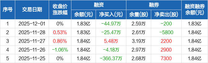 融资方面,当日融资买入425.34万元,融资偿还470.31万元,融资净偿还44.97万元。融券方面,融券卖出100股,融券偿还300股,融券余量2.59万股,融券余额24.48万元。融资融券余额合计1.83亿元。