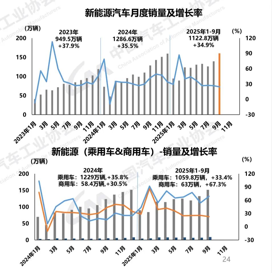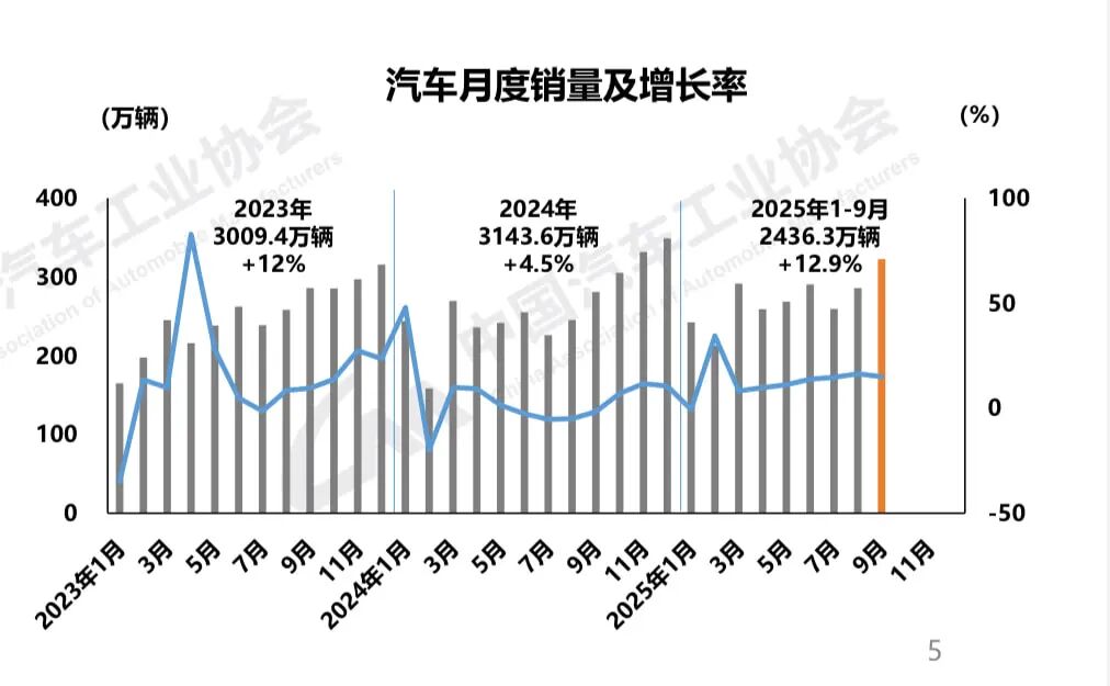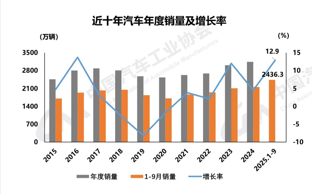 根据中汽协统计,9月,中国汽车产销分别完成327.6万辆和322.6万辆,环比分别增长16.4%和12.9%,同比分别增长17.1%和14.9%。2025年前三季度,中国汽车产销累计完成2433.3万辆和2436.3万辆,同比分别增长13.3%和12.9%。