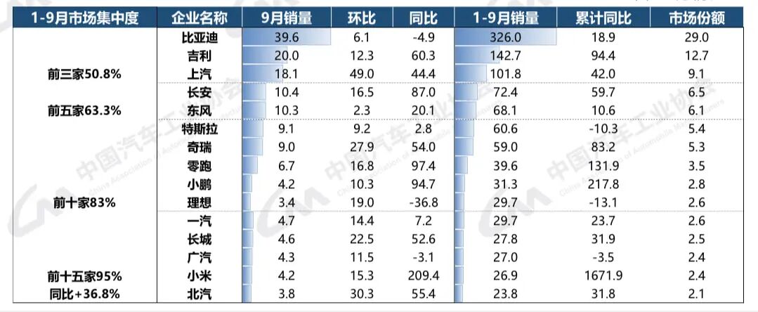 新能源汽车销量排名前十五位的集团销量数据单位:万辆、%