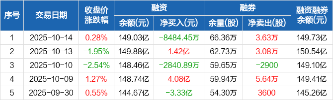 比亚迪:融资净偿还8484.45万元,融资余额149.03亿元(10-14)