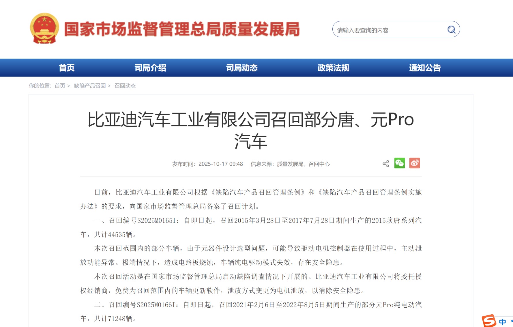 其中,召回编号S2025M0165I为:自即日起,召回2015年3月28日至2017年7月28日期间生产的2015款唐系列汽车,共计44535辆。