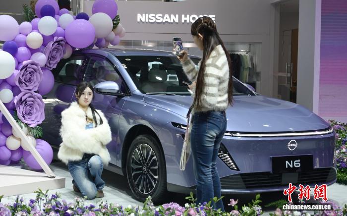年轻人在车企布置的打卡区拍照。中新网记者唐小晴摄