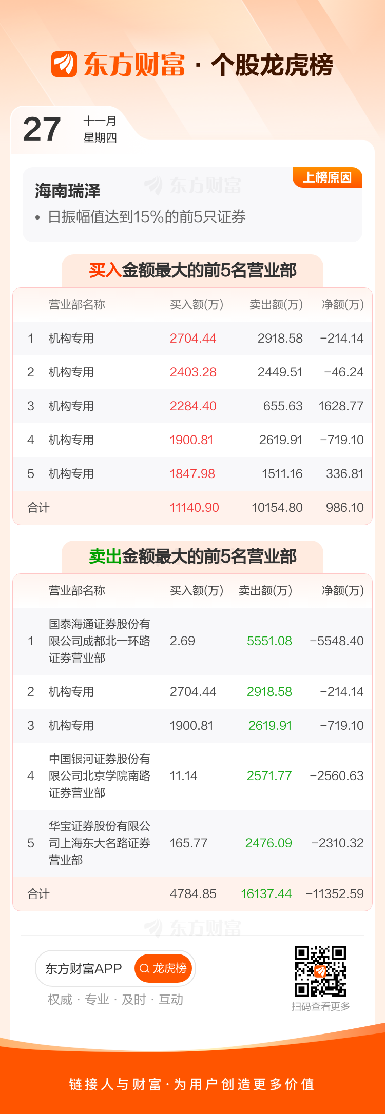 海南瑞泽(002596)龙虎榜数据(11-27)