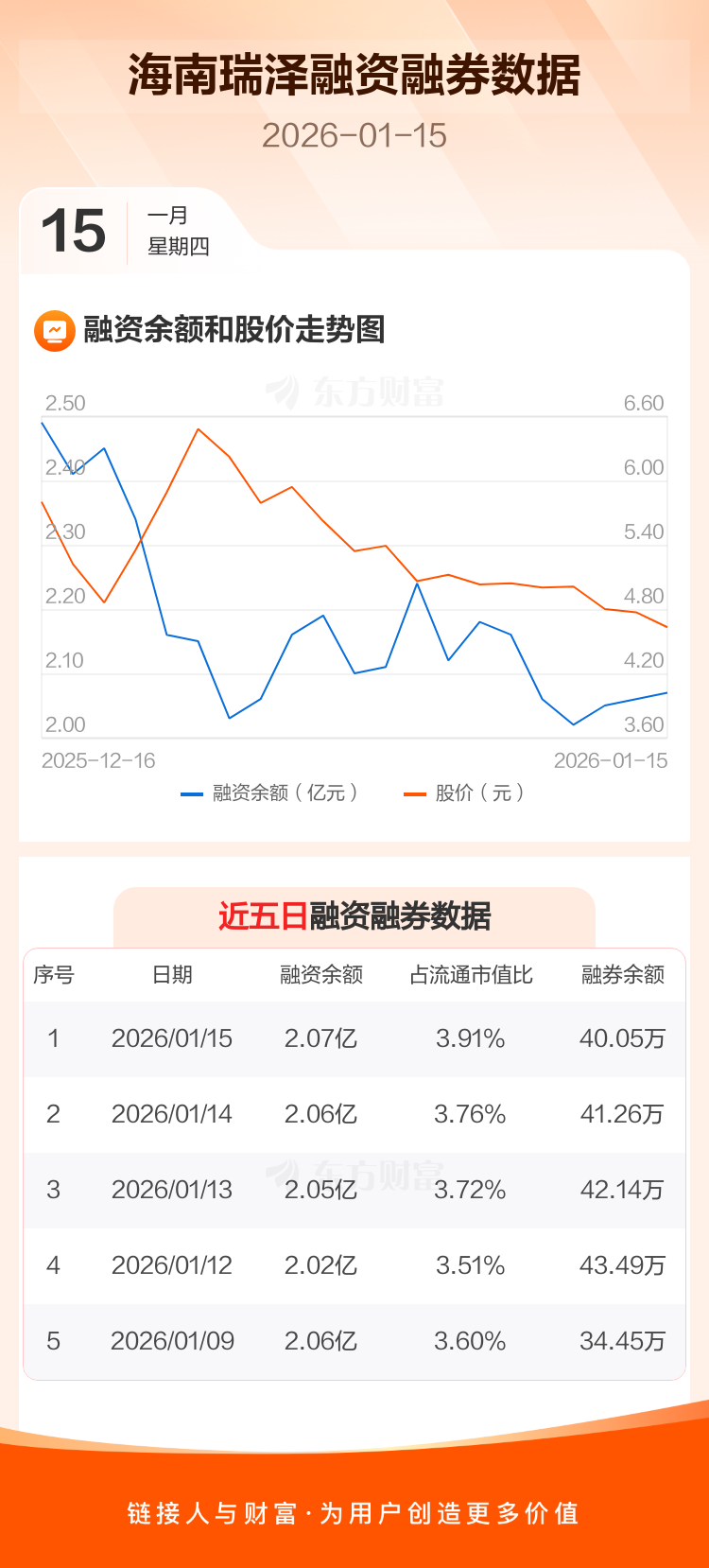 交易所最新数据显示,海南瑞泽于2026年1月15日获融资买入1841.75万元,融资偿还1686.37万元,当日融资净买入155.38万元。目前,该股融资余额2.07亿,占流通市值比例为3.91%。