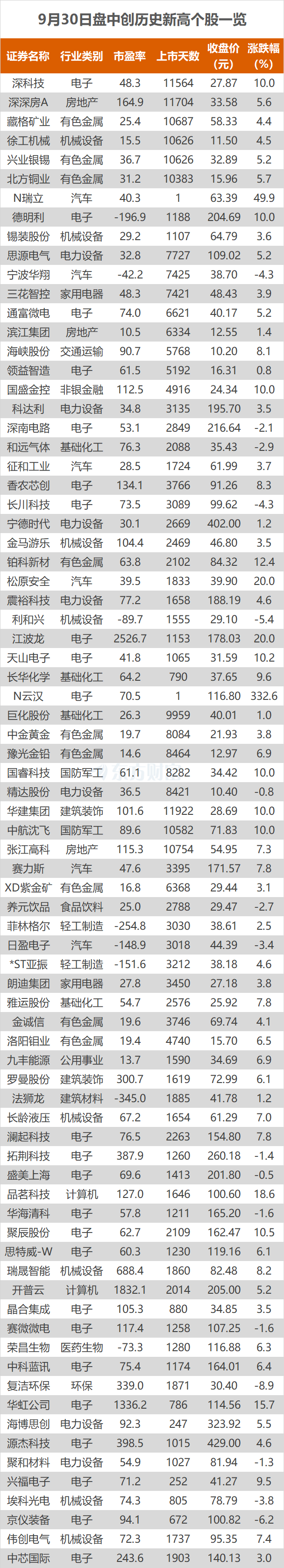 9月30日,A股三大指数今日集体上涨,截止收盘,沪指涨0.52%,收报3882.78点;深证成指涨0.35%,收报13526.51点;创业板指涨0.00%,收报3238.16点;科创50指数涨1.69%,收报1495.29点。东方财富Choice数据显示,今日有78只个股盘中股价创历史新高,分别为领益智造、三花智控等。