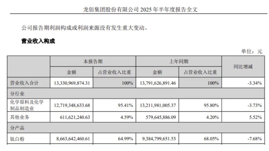 2025年上半年,龙佰集团的营业收入同比下降3.34%至133.31亿元,其中,钛白粉的业务收入为86.64亿元,占营业收入的64.99%。