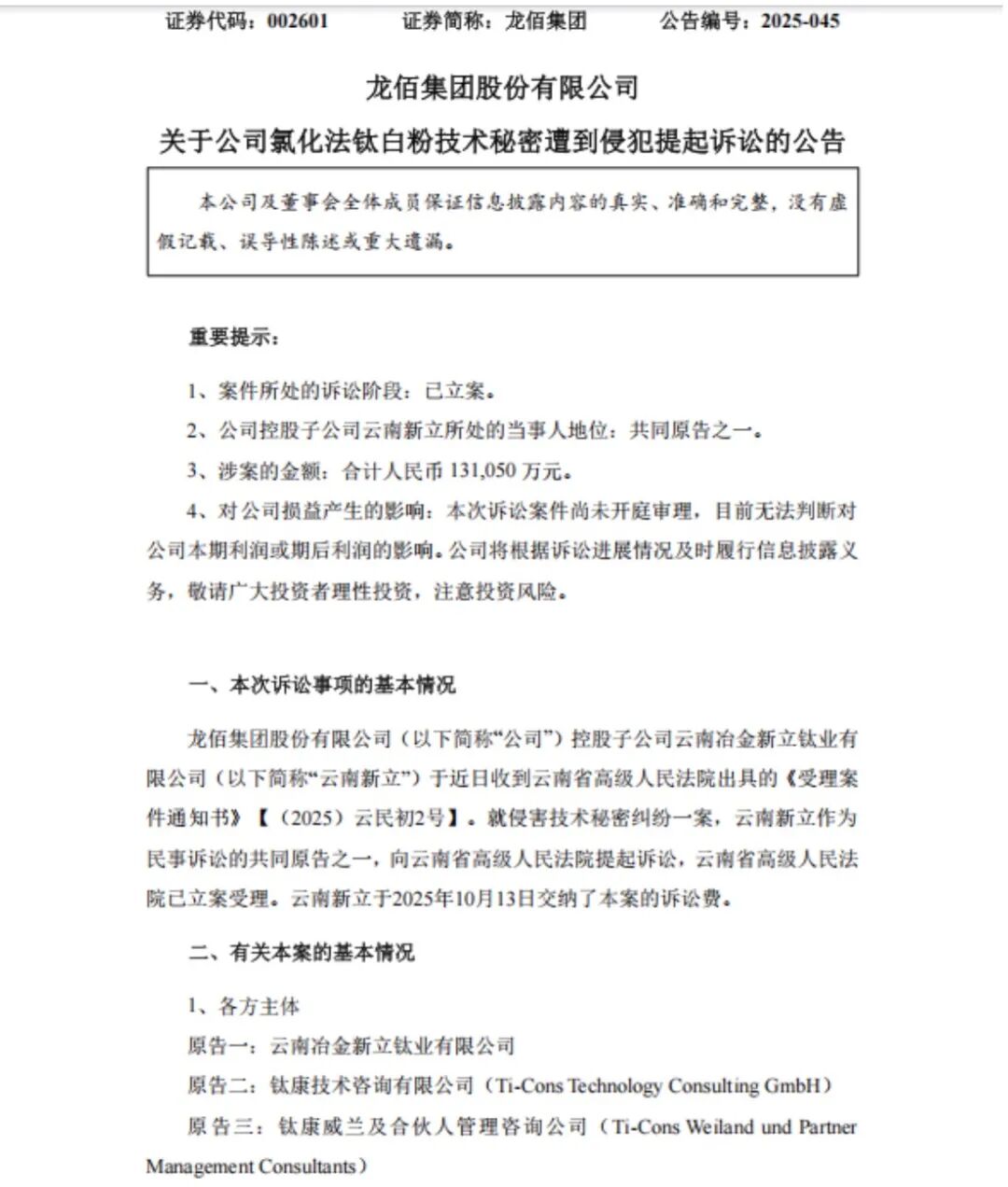 10月14日晚间,龙佰集团发布公告称,公司控股子公司云南新立钛业有限公司(以下简称云南新立)作为共同原告之一,就技术秘密被侵犯向云南省高级人民法院提起诉讼,涉案金额合计13.105亿元。