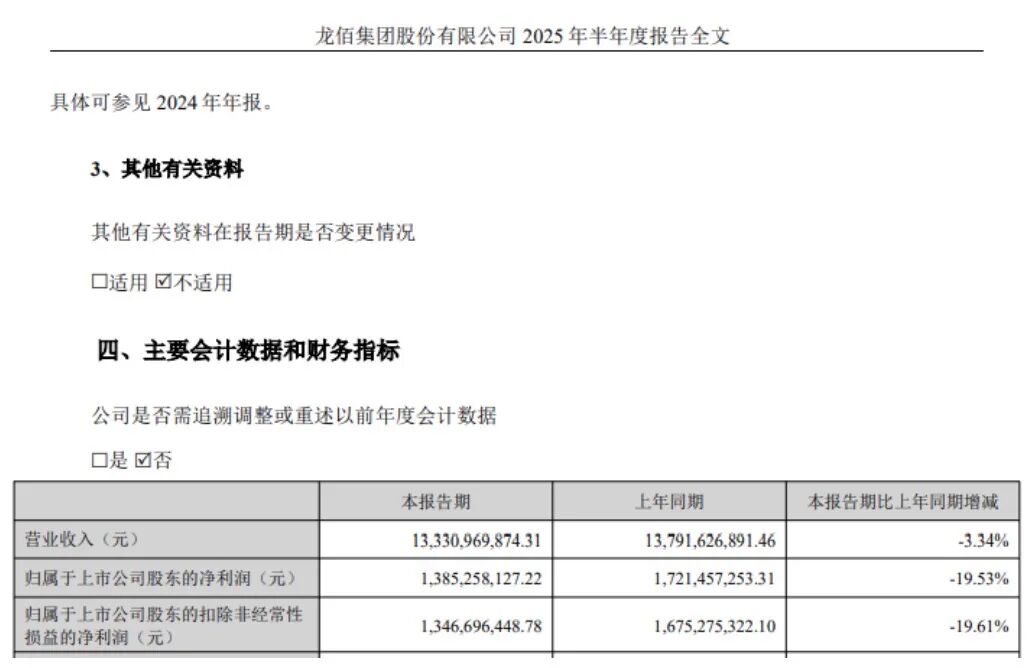 2025年上半年,龙佰集团的归母净利润同比下降19.53%至13.85亿元,扣非后净利润同比下降19.61%至13.47亿元,主要是钛白粉价格下降所致。