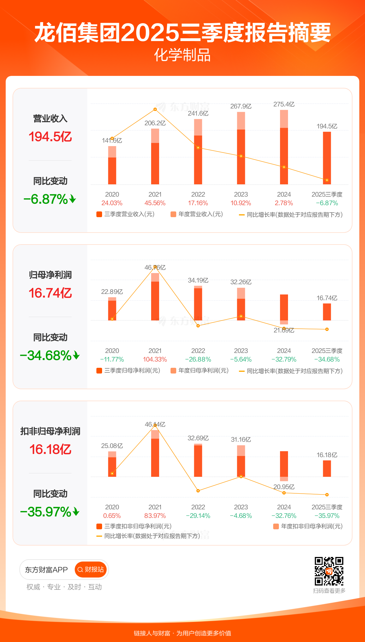龙佰集团10月28日发布2025年三季报显示,公司前三季实现营业收入194.51亿元,同比下滑6.87%;归母净利润16.74亿元,同比下滑34.68%;扣非归母净利润16.18亿元,同比下滑35.97%。