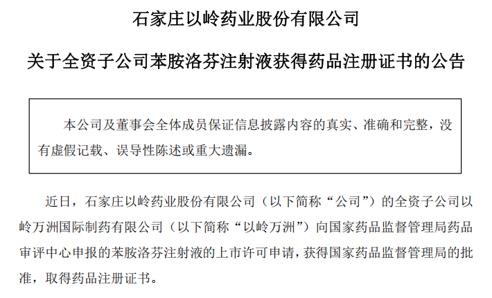 与此同时,以岭药业也同步发布公告称,其全资子公司以岭万洲国际制药有限公司首个自主研发的化药新药万舒安®(苯胺洛芬注射液)获国家药监局批准上市。