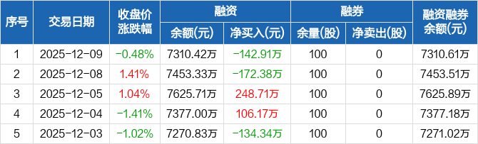 亚玛顿:融资净偿还142.91万元,融资余额7310.42万元(12-09)