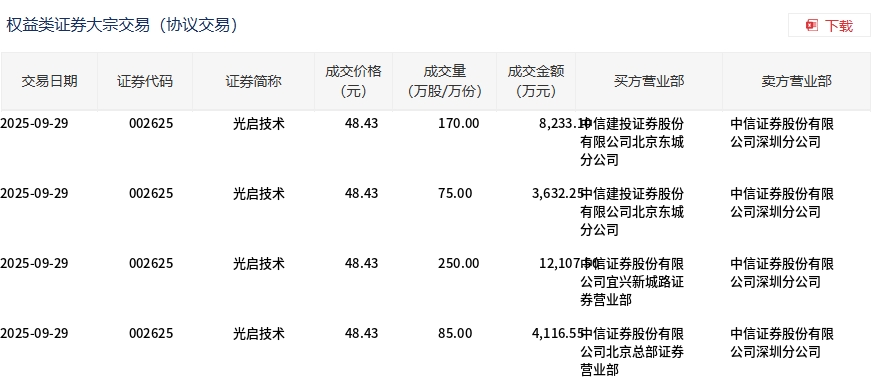 光启技术今日大宗交易折价成交580万股,成交额2.81亿元