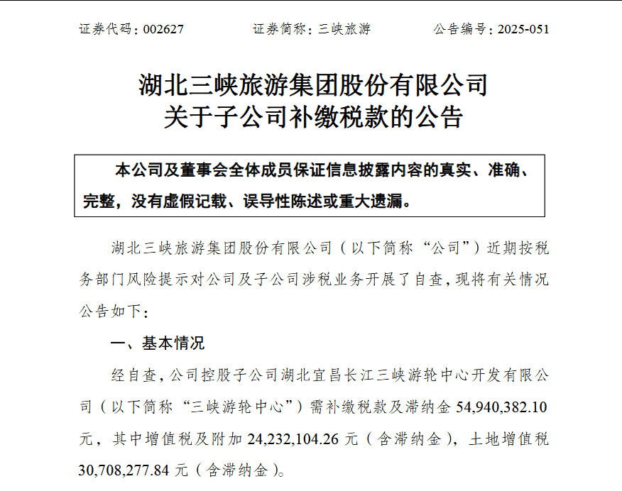 按税务部门风险提示开展自查!三峡旅游子公司补缴税款5494万元 影响净利4433万元